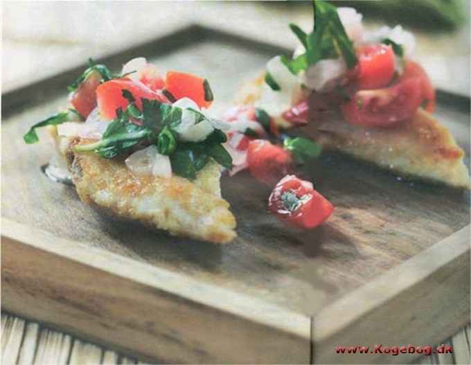 Det magre kyllingekød tåler sagtens en sauce med rigelig olie som denne "Sauce Vierge", der er en fransk udgave af tomatsalsa. Retten er et kæmpe hit Kylling med jomfrusauce