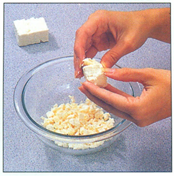 Hæld vandet ud. Smuldr fetaen med fingrene.
