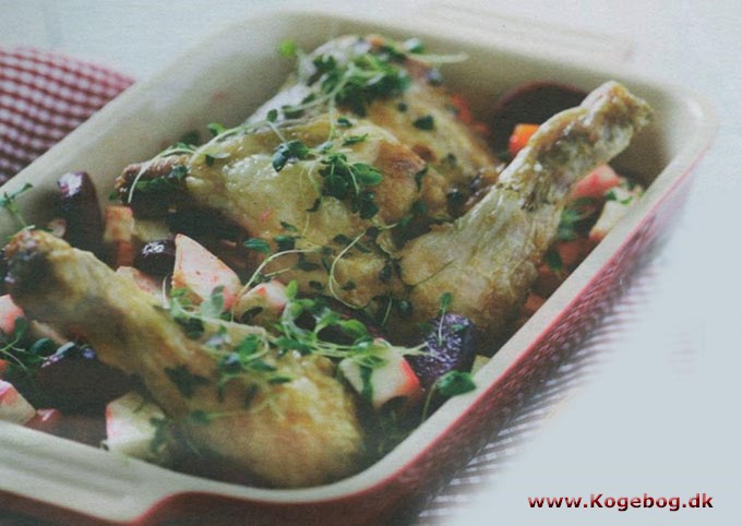 3. Stil fadene i ovnen ved 200 °C i ca 1 time, til kyllingen er gennemstegt og rodfrugterne møre.