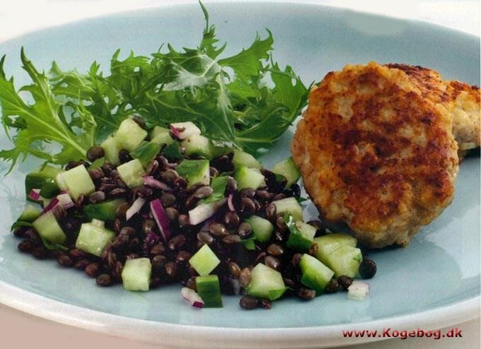 Sådan laver du Kyllingefrikadeller med agurke-linsesalat: