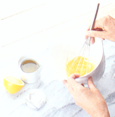 2. Rør æggeblommen sej med salt og citronsaft eller eddike, lettest i en rundbundet skål.