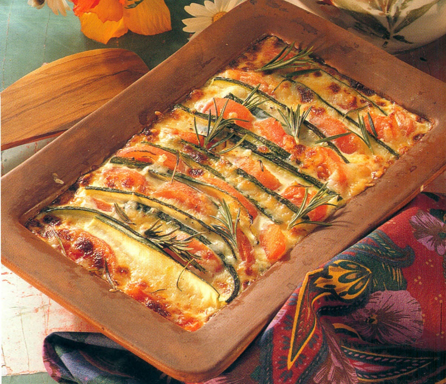 Mild squash og solmodne tomater tilberedes her linder et krydret ostedække - en saftig og frisk godbid! Vask squash og tomater grundigt, så alle eventuelle sprøjtemidler forsvinder.