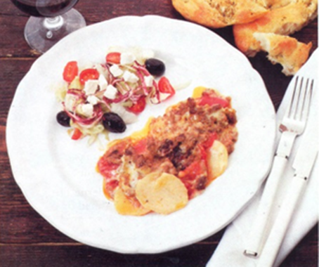 INFO: Moussaka, musaka eller mousaka er en aubergine- eller kartoffel-baseret madret, der ofte inkluderer hakkekød. Retten stammer fra Levanten og er særligt udbredt i Mellemøsten og Balkan med mange lokale og regionale variationer.