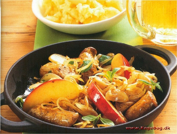 20 g smør kommes på panden, og løg- og æblebåde steges gyldne.