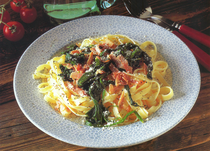 Hurtigt, enkelt og ovenikøbet en mager ret, alligevel er den også en sand fryd for sanserne - sådan er denne pastaret med spinat, røget skinke og stærk ost.