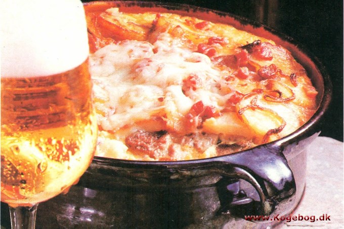 og kød lagvis i et smurt ovnfast fad.