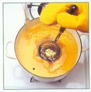 (Det skal sikres at bunden af termometeret ikke rører bunden af gryden.)