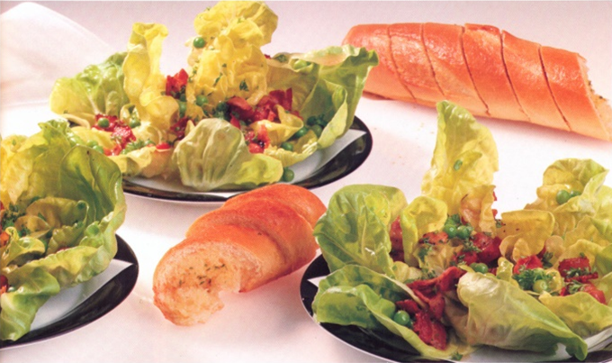 4. Fordel baconstykker og ærter i salathovederne, kom marinaden over og drys med hakket persille.