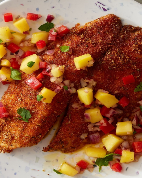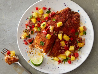 Denne fisk får et strejf af knas fra majsmel i den sorte krydderi. Blandingen er nem nok at blande i forvejen, så lav en stor portion, så den er klar, når du vil lave denne nemme aftensmad med fisk og skaldyr.