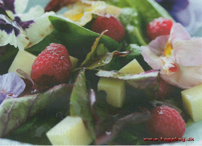 Server en skål salat med smukke stedmoderblomster, hindbærvinaigrette, friske hindbær og en god ost til grillspid og kartofler. Salaten er fyldigt tilbehør og smager forrygende. Vores opskrift er nem og giver en fantastisk smagfuld salat