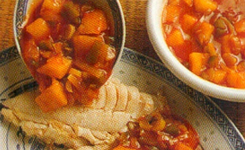 Anret på tallerkener og hæld den sursøde grønsagssauce over.