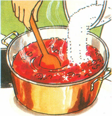 Hvis der skal geléringsmiddel i syltetøjet røres det med 1-2 tsk sukker og