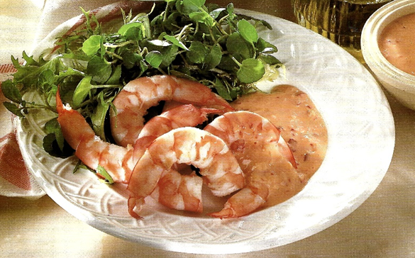 En af de mest populære dressinger. Den er utrolig anvendelig, fx med blandet salat, i sandwiches eller burgere. Dressingen er her vist med brøndkarse og rejer.