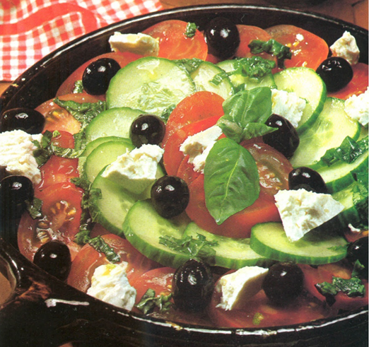 Salat med solmodne tomater, agurk, oliven, feta, citron, basilikum og andet godt er en af de salater, som bringer tankerne til en dejlig sommeraften i Grækenland!