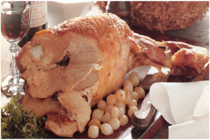 Aftensmad Hovedret. Arbejdstid: 30 min. Marinering: 2-3 døgn. Stegetid i alt: ca 2½ time. Skal hvile, kød: 10-15 min. Kogetid, sauce: ca 5 min. Middelsvær at lave. Høj pris. 8-10 personer.