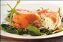 Læg en portion dressing på bladselleristilkene og top med strimler af spegeskinke. En meget flot anretning til en forret, en buffet, natmad eller blot til 1